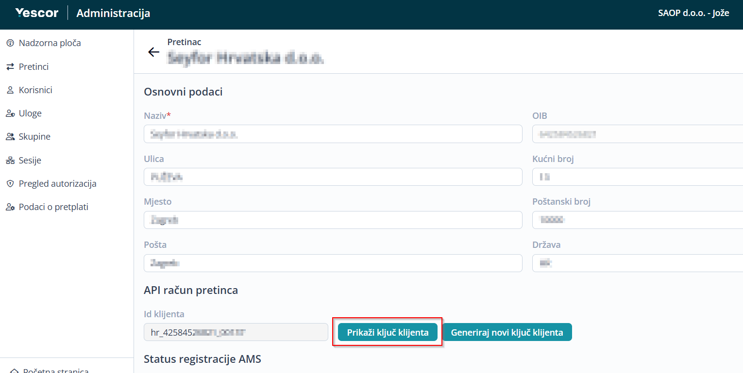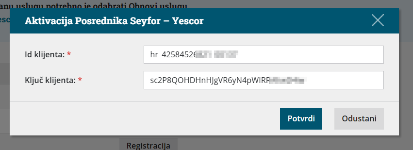 Ova uputa odnosi se na slučaj kada korisnik u Minimaxu treba unijeti ID klijenta i Ključ klijenta za Obnovu usluge informacijskog posrednika Seyfor, a te podatke preuzima u Yescor portalu.
