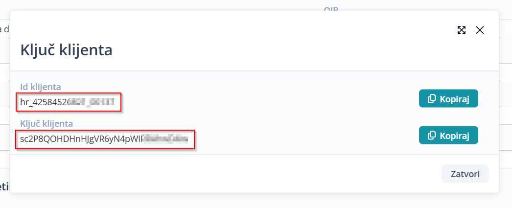 - Prikazat će se podaci Id klijenta i Ključ klijenta koje prekopirate u Minimax