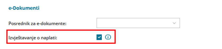 Prije rada u samom modulu potrebno je provjeriti je li u Postavkama organizacije u dijelu e-Dokumenti označena kvačica na Izvještavanje o naplati.