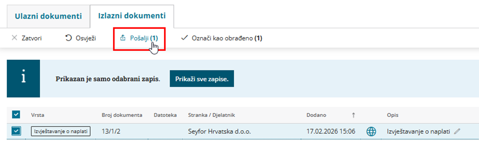 - Nakon toga na statusu zapisa se prikaže U pretincu i klikom na navedeno program nas prebaci u Pretinac za dokumente u kojem označimo račune