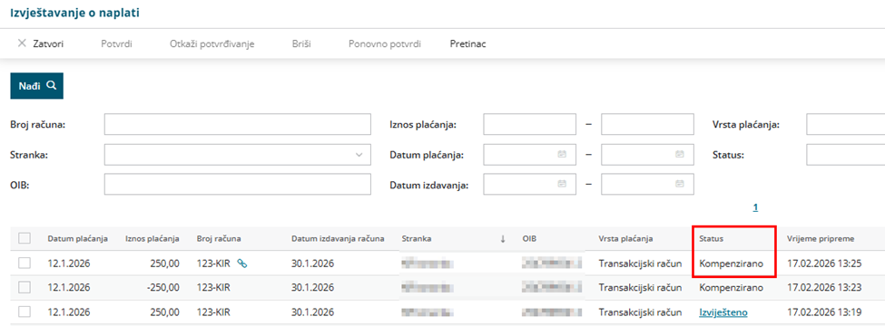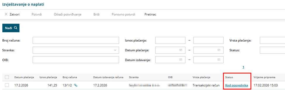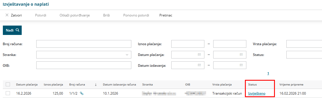 Status pojedinog zapisa provjeravamo u modulu Izvještavanje o naplati u stupcu Status.