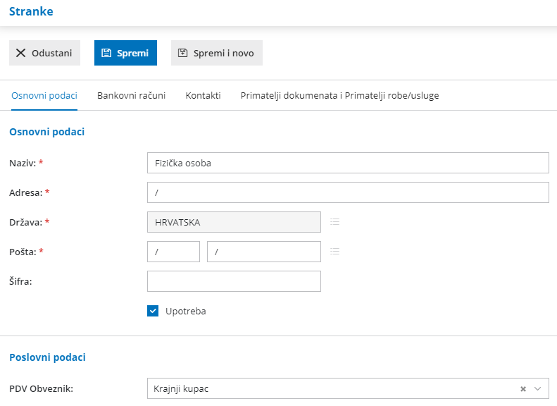 Za poslovanje s fizičkim osobama (na primjer za izlazni račun), kupca treba unijeti u šifrarnik stranaka.