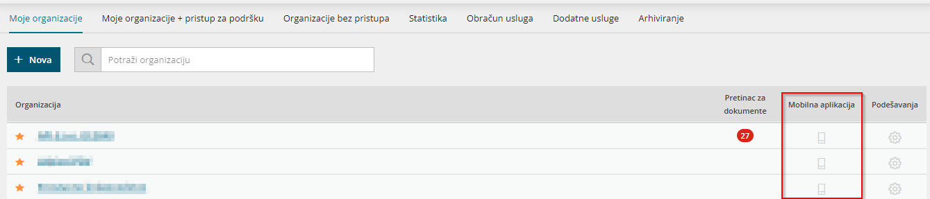 - Administrator na početnoj stranici web aplikacije Minimax, na popisu organizacija, u retku organizacije kojoj želi dodijeliti korisniku pristup mobilnoj aplikaciji, klikne na ikonu za mobilnu aplikaciju.