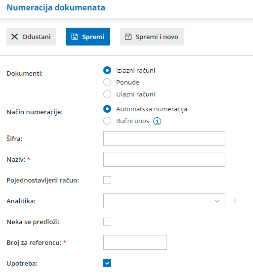 Kod unosa dokumenta možemo odabrati vrstu numeracije, a prema zadanim postavkama bit će već postavljena ona za koju smo odlučili "da se predlaže".