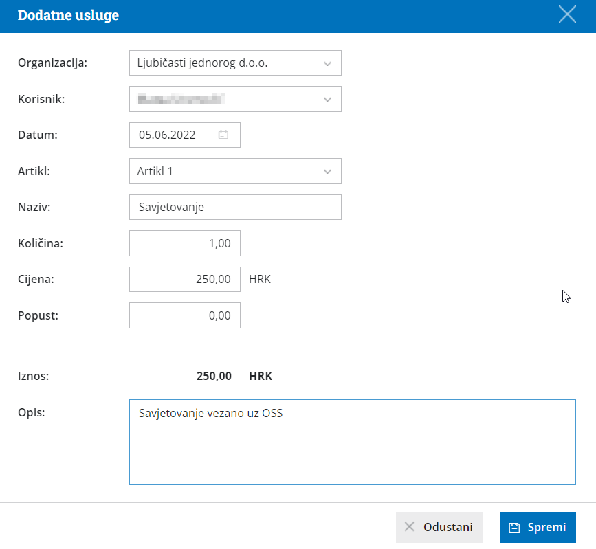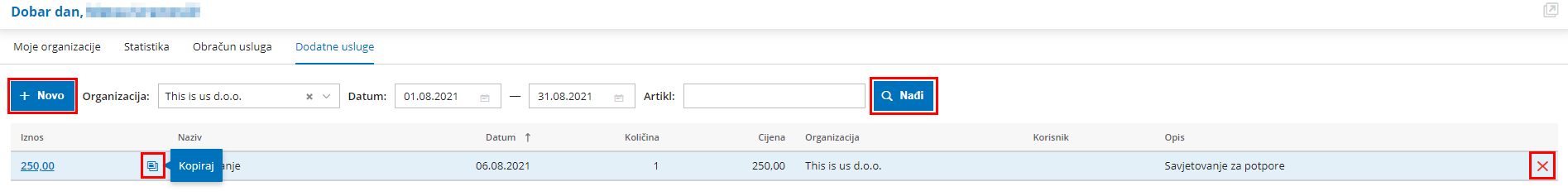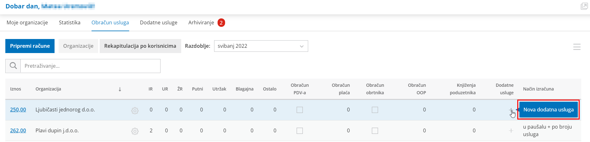 Na retku obračuna za pojedinu stranku odaberemo Nova dodatna usluga.