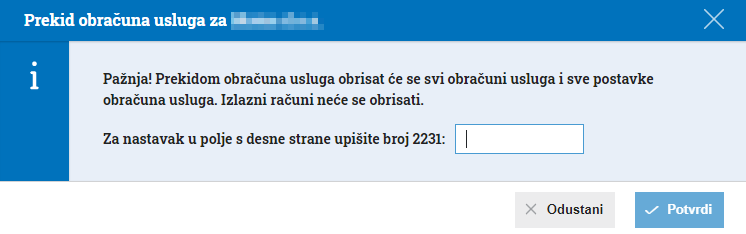Klikom na prekid program prikaže obavijest o otkazivanju usluge s napomenom da se formirani izlazni računi neće obrisati. Upisivanjem broja u predviđeno polje i klikom na Potvrdi funkcionalnost je otkazana.
