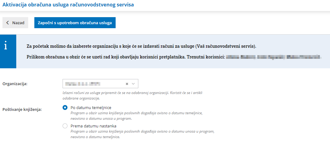 Za početak je potrebno aktivirati funkcionalnost obračuna usluga (samo jednom). Aktivacijom obračuna usluga omogućeno je formiranje obračuna za najviše 3 mjeseca unatrag.