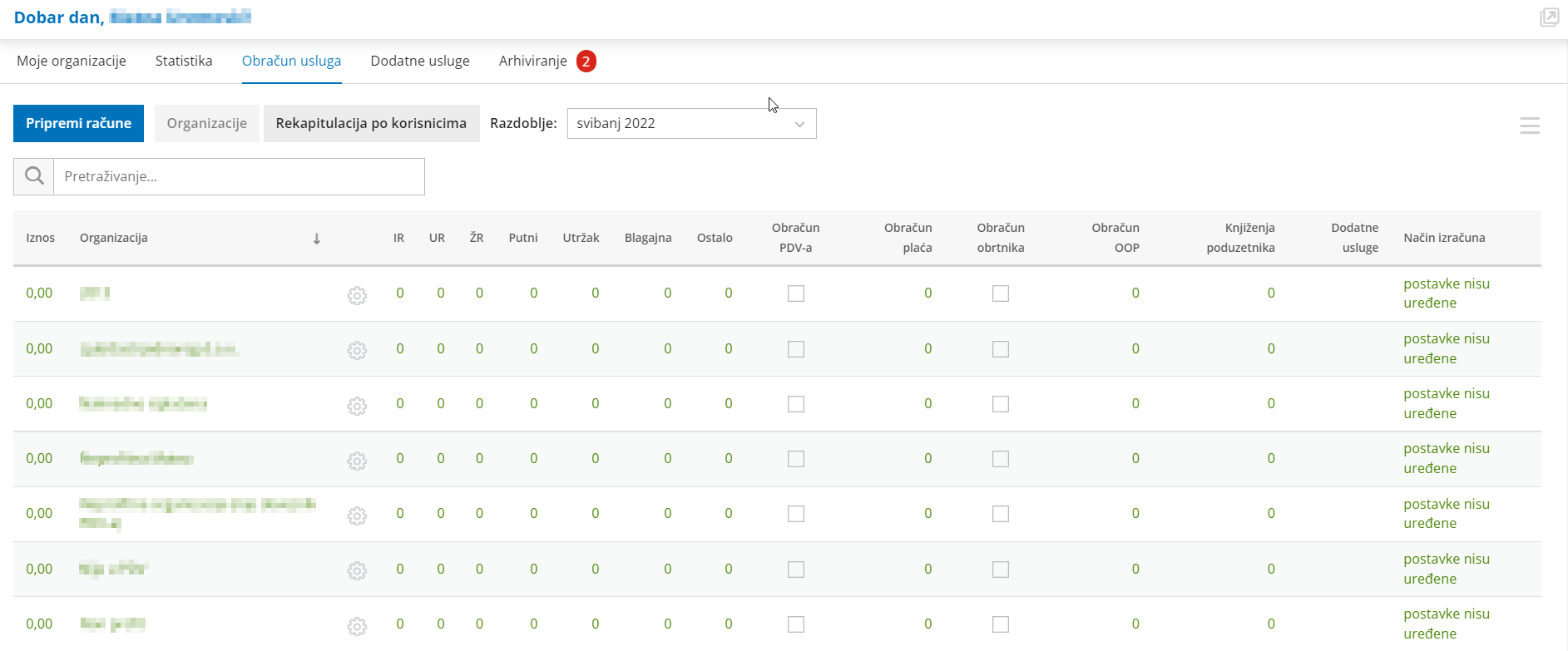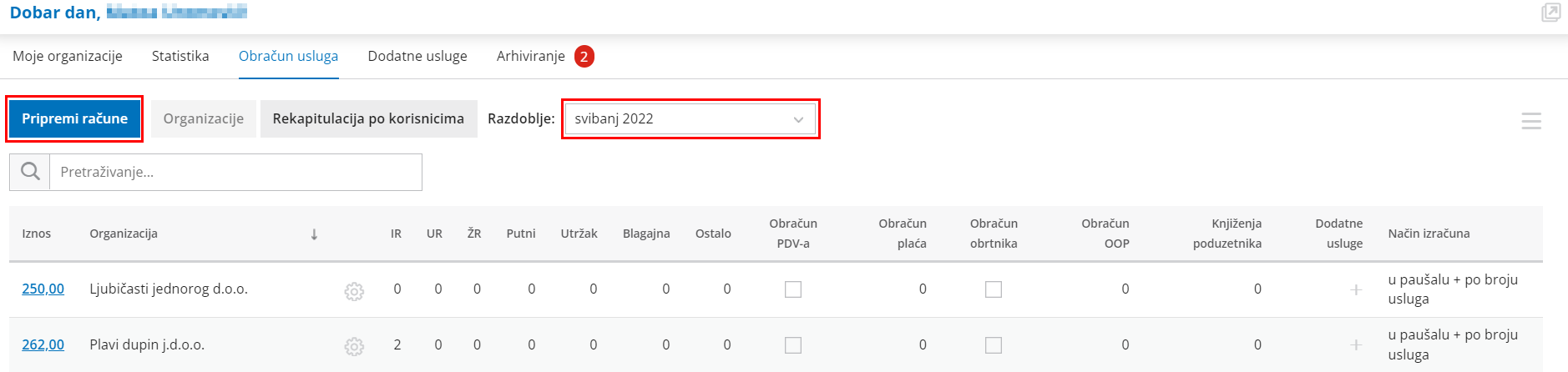 Prije pripreme računa možemo provjeriti što je zaračunato pojedinoj stranci. Na pregledu svih stranaka za obračun usluga kliknemo na iznos pokraj pojedine organizacije i program prikaže usluge koje će joj se zaračunati.