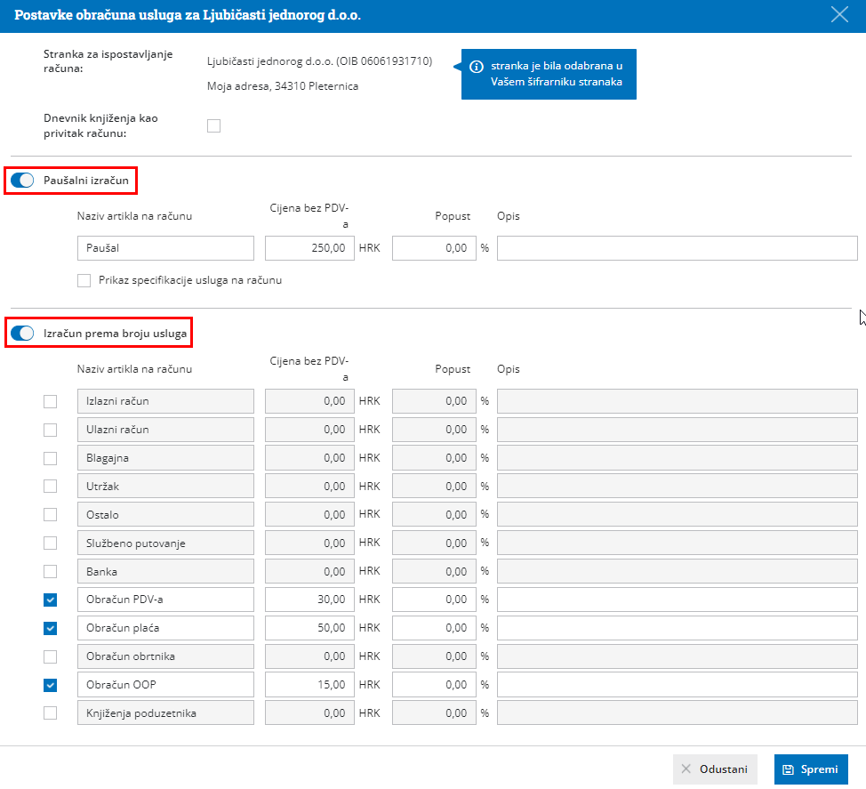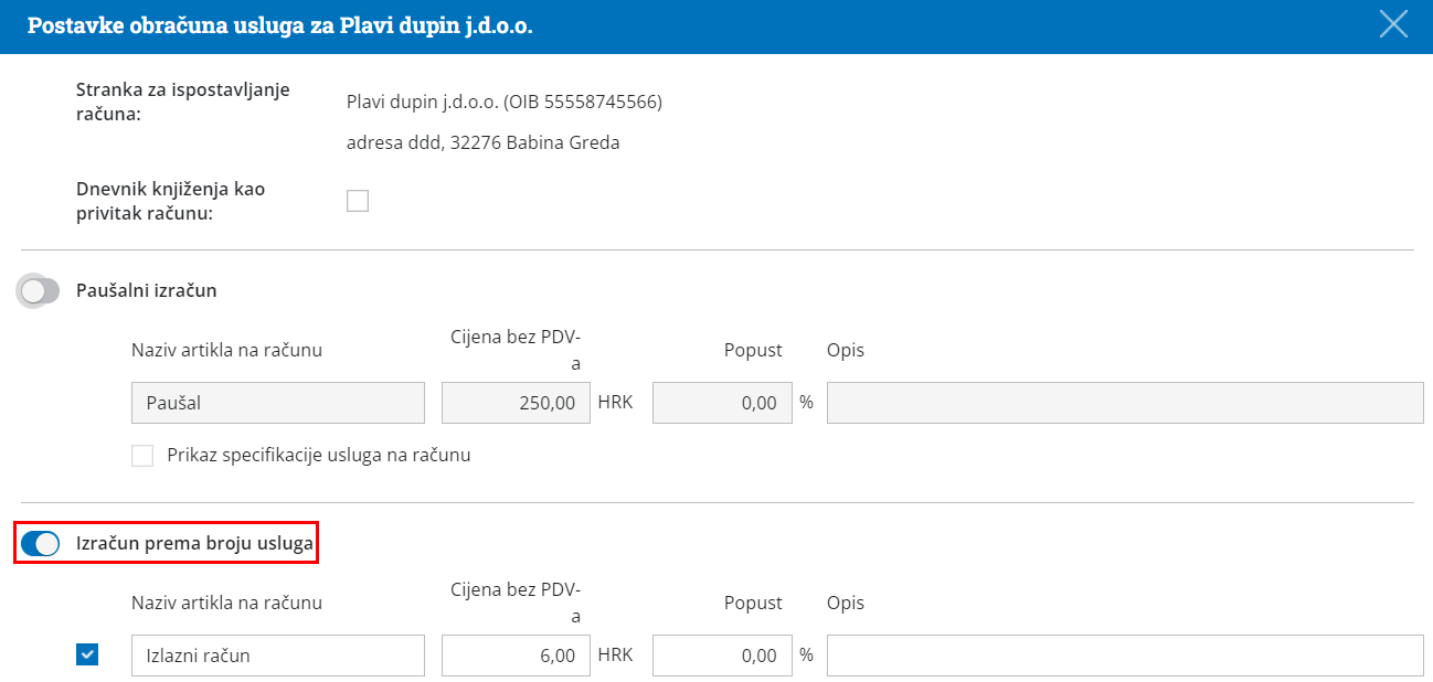 U tom ćemo primjeru postavke za obračun usluga urediti tako da uključimo i obračun prema paušalu i prema broju usluga.