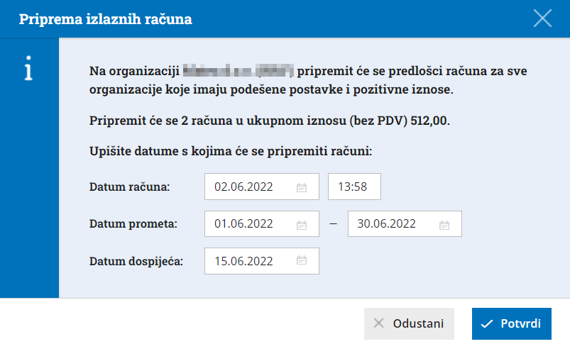 - Klikom na Potvrdi program pripremi predloške izlaznih računa za sve stranke sukladno postavkama obračuna za pojedinu organizaciju.