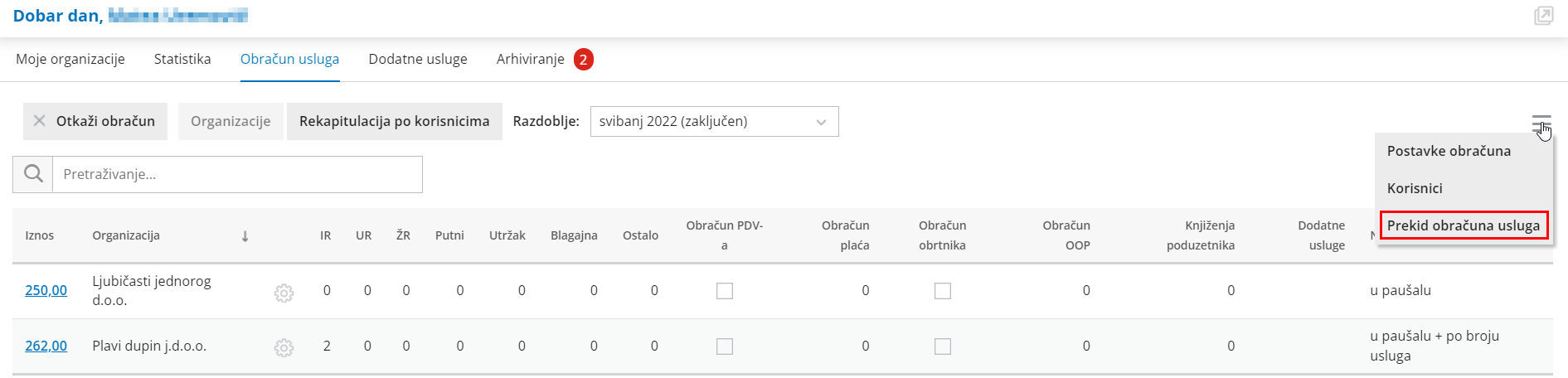 Ako u nekom trenutku odlučimo da više ne želimo koristiti funkcionalnost obračuna usluga računovodstvenog servisa, funkcionalnost možemo otkazati klikom na ikonu tri crtice u desnom kutu i odabirom Prekid obračuna usluga.