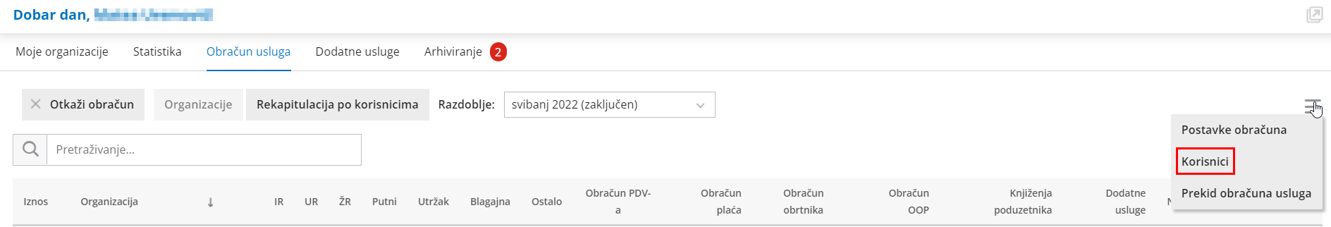 gdje možemo odabrati obračun prema paušalu i/ili poslovnom događaju, a na mjesečni obračun možemo dodati i ostale dodatne usluge.- na postavkama klikom na Pristup korisnicima za obračun usluga možemo pregledati korisnike koji imaju pristup do pregleda i obrade usluga,