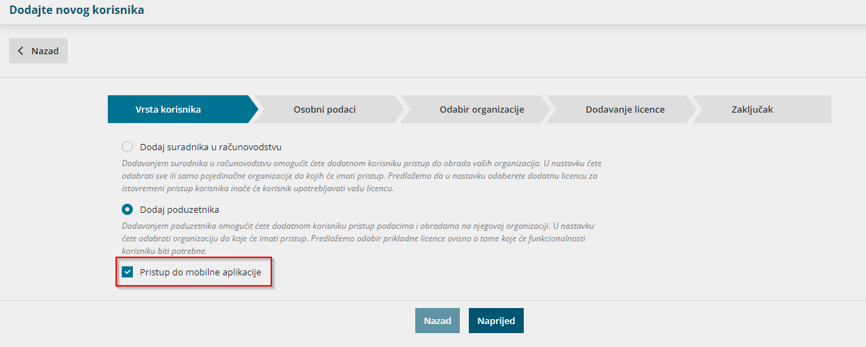 - Prilikom dodavanja korisnika odabiremo odgovarajuću licencu. Za pristup Minimaxu putem mobilne aplikacije dovoljna je licenca za pregled podataka.