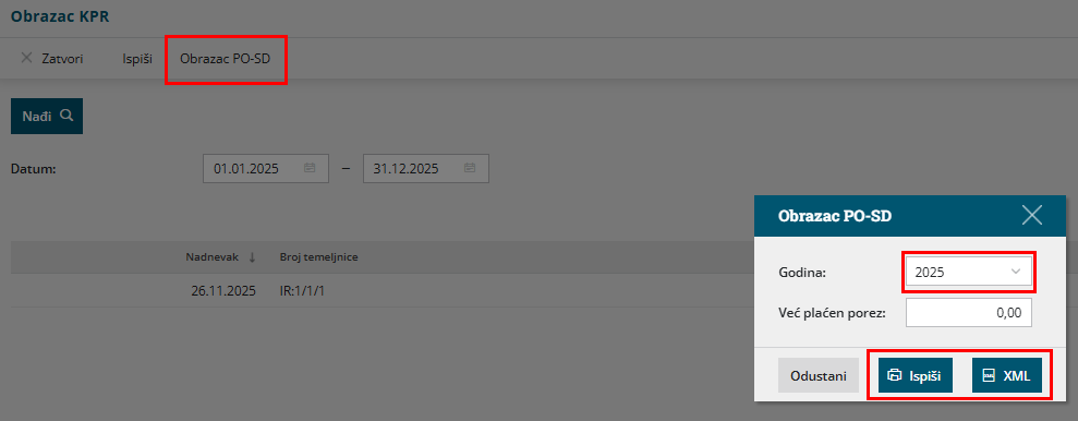 Nakon odabira godine otvara se mogućnost unosa već plaćenog iznosa poreza tijekom godine, klikom na Ispiši pripremit će se PO-SD obrazac u pdf formatu, a klikom na gumb XML možete preuzeti obrazac za uvoz na Poreznu.