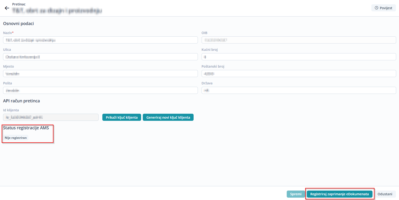 - U slučaju kada Status registracije AMS nije: „Registriran“, kliknete se na opciju „Registriraj zaprimanje eDokumenata“.