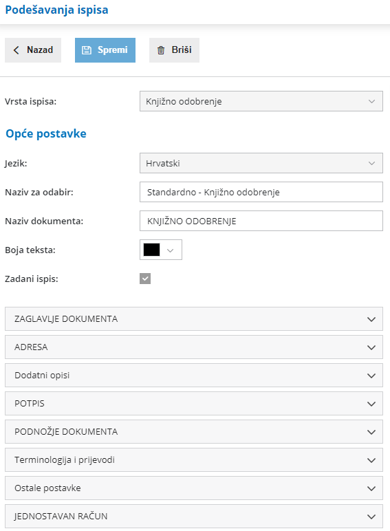 Postavke za ispis knjižnog odobrenja uređujemo direktno u predlošku Knjižnog odobrenja.