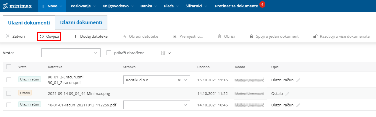 U pretincu za dokumente program u intervalima provjerava ima li novih ulaznih e-računa i, ako ih ima, računi se prikažu u pretincu. Klikom na Osvježi možemo u bilo kojem trenutku ručno provjeriti imamo li koji ulazni e-račun.
