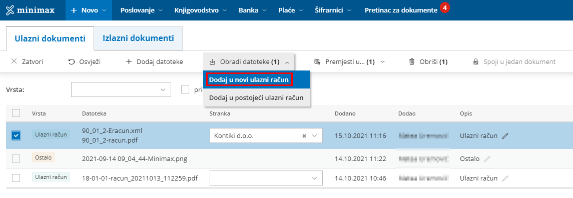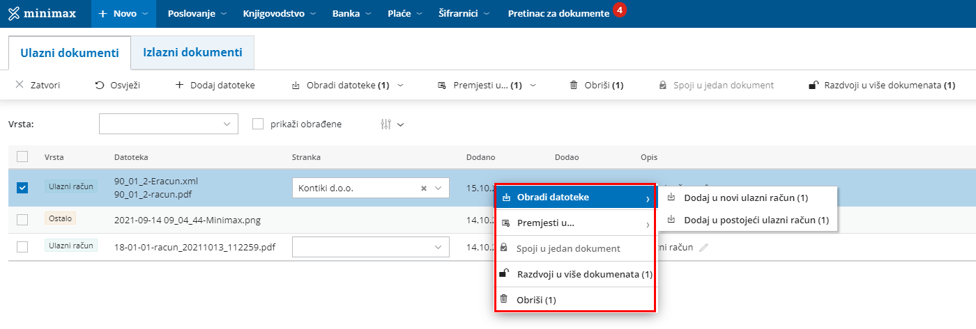 Zaprimljene račune moguće je obrađivati pojedinačno, a moguće je i odabrati više datoteka za obradu i preko funkcionalnosti Spoji i dodaj u novi ulazni račun formirati predložak računa. Kod te funkcionalnosti važno je da budu odabrani dokumenti iste stranke (npr. račun i otpremnica, dvije skenirane stranice jednog računa i sl.) i da nije odabrano više datoteka koje sadrže e-račun.