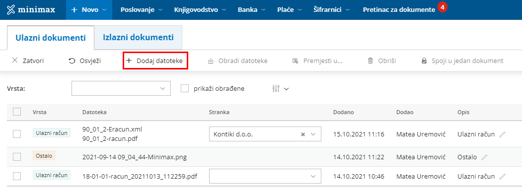 Osim automatskog zaprimanja, primljeni e-račun možemo ručno uvesti u Minimax klikom na +Dodaj datoteke i odaberemo datoteku ulaznog računa u xml formatu.