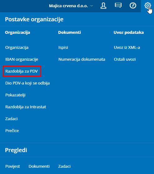 Otvaranjem nove organizacije možemo odmah označiti je li organizacija obveznik PDV-a ili nije. Taj podatak možemo kasnije promijeniti klikom na Postavke organizacije > Razdoblja za PDV. Otvoreno razdoblje za PDV znači trajanje statusa nekog obveznika.