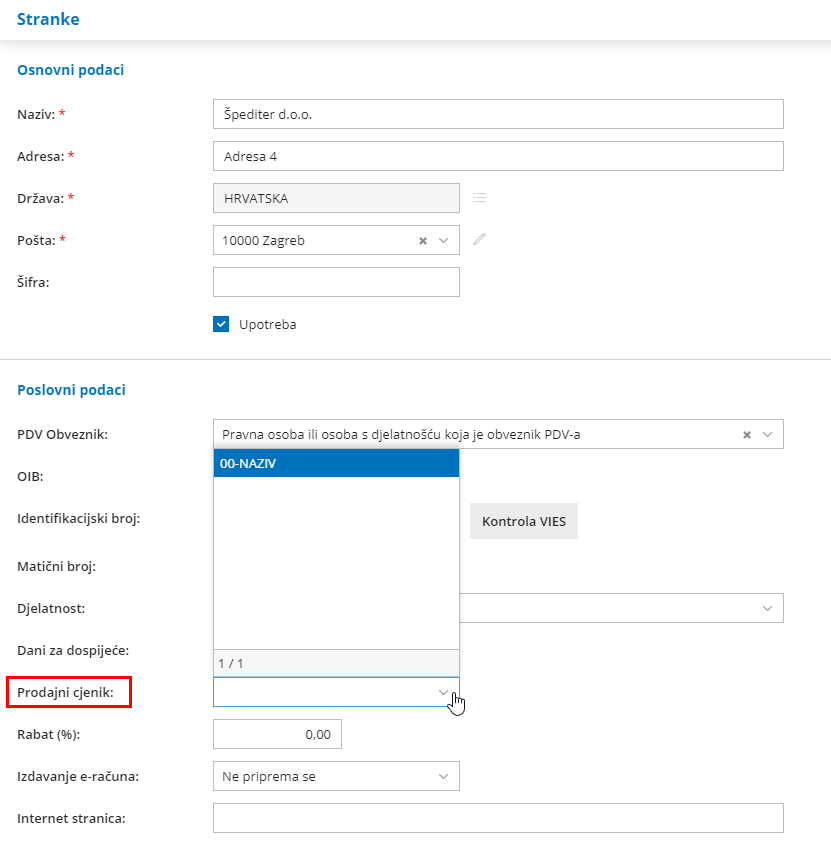 Zatim u Šifrarnici > Stranke > na polju > Prodajni cjenik odredimo taj cjenik. Cjenik će automatski biti uzet u obzir kod izdavanja izlaznog računa za odabranog klijenta.