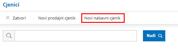 - U izborniku Šifrarnici > Cjenici > Novi nabavni cjenik.