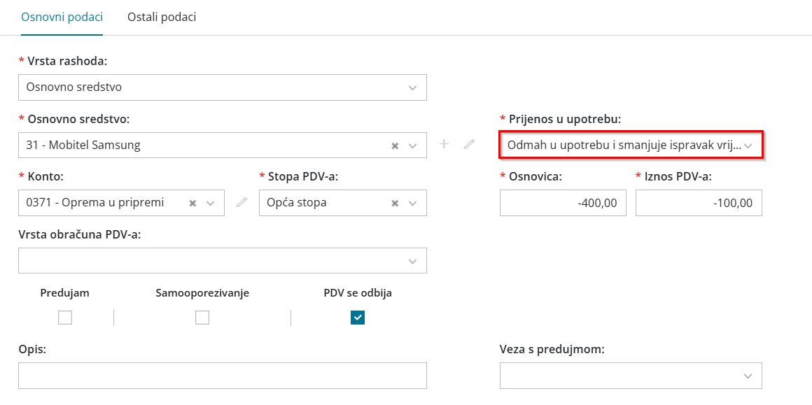- Odaberemo Odmah u upotrebu i smanjuje ispravak vrijednost. (Vrijednost će se smanjiti jer je iznos negativan).