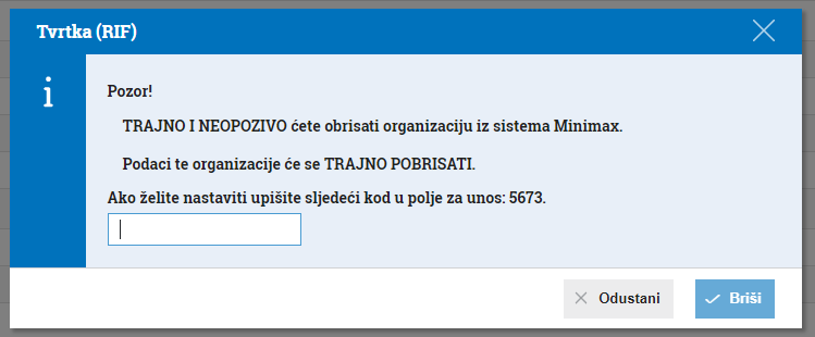 Brisanjem organizacije iz programa Minimax NEPOVRATNO će se obrisati svi njezini podaci i knjiženja.