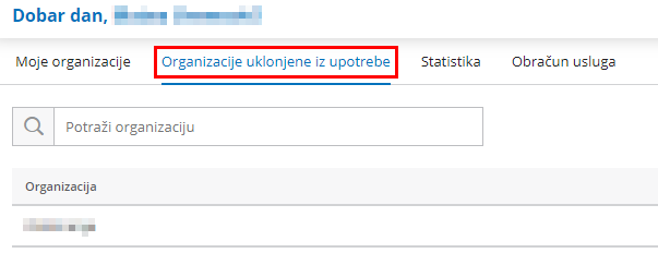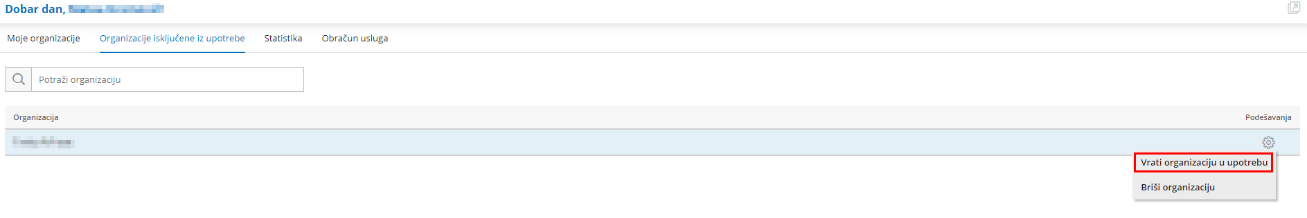 Klikom na Vrati organizaciju u upotrebu korisnik može u bilo kojem trenutku organizaciju ponovno aktivirati i ona će se prenijeti u polje Moje organizacije.